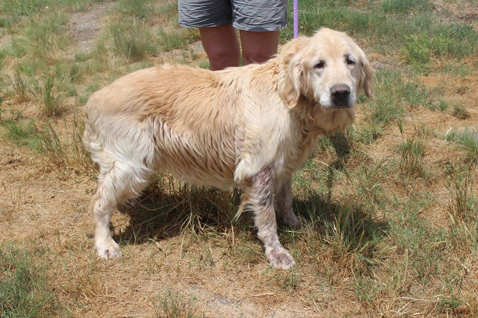 The golden retriever sat tied to a tree in a yard, left behind after his owners moved out of the house. The older dog had owners who had given him a place to live and stay, but when it was time to move, they left him behind.